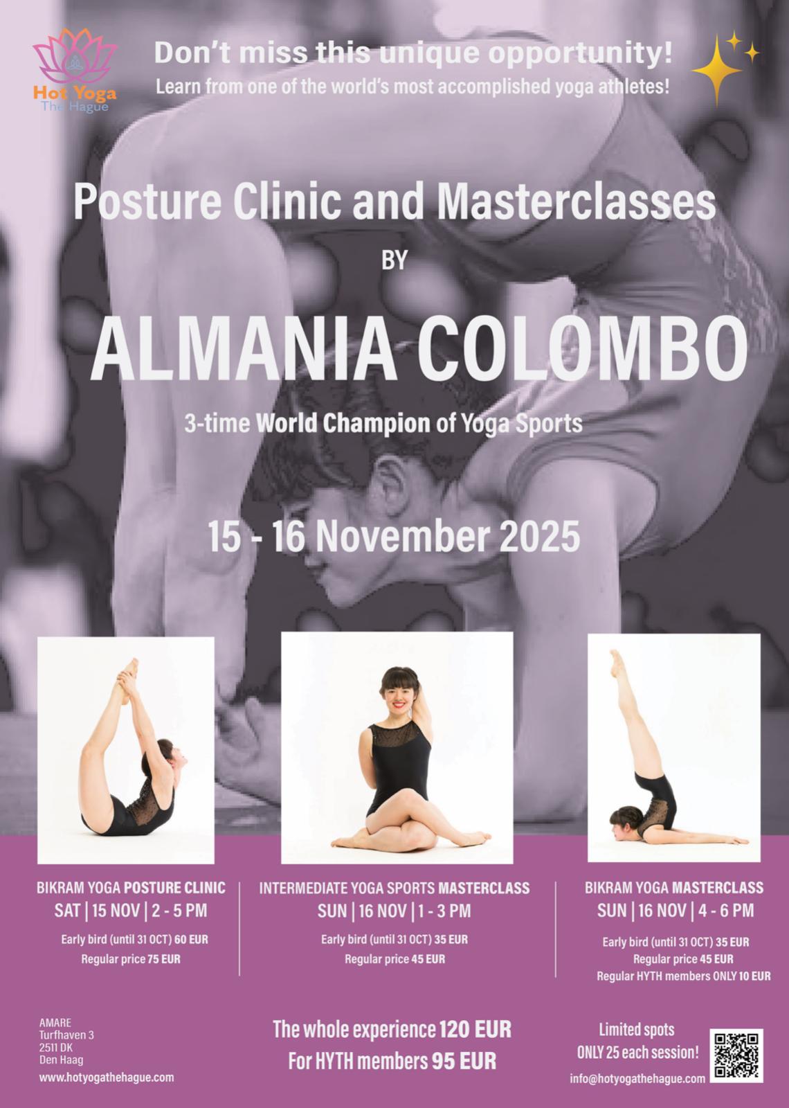 - Almania Colombo, a three-time World Champion in Yoga Sports, will be leading the 2-hour Master Class for the Original Bikram Hot Yoga Class.